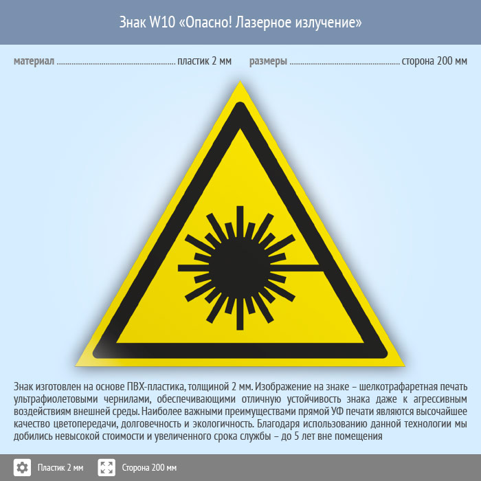 Знак W10 «Опасно! лазерное излучение» (пластик, сторона 200 мм) в Твери купить