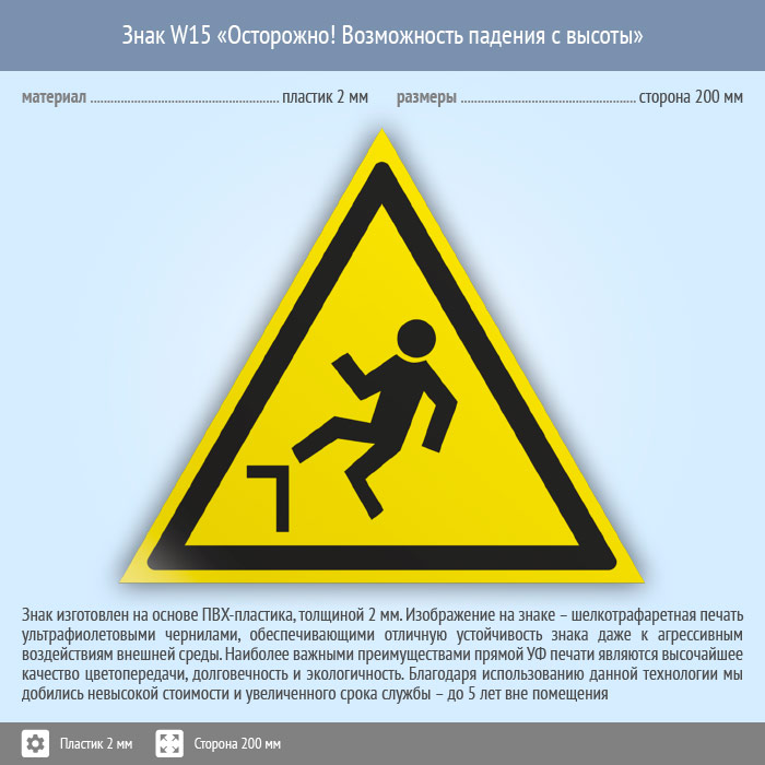 Знак W15 «Осторожно! возможность падения с высоты» (пластик, сторона 200 мм) в Твери купить
