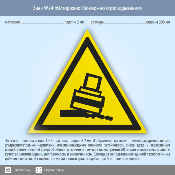 Знак W24 «Осторожно! возможно опрокидывание» (пластик, сторона 200 мм) в Твери купить