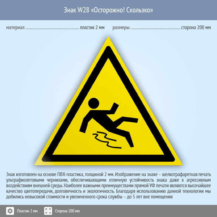 Знак W28 «Осторожно! скользко» (пластик, сторона 200 мм) в Твери купить