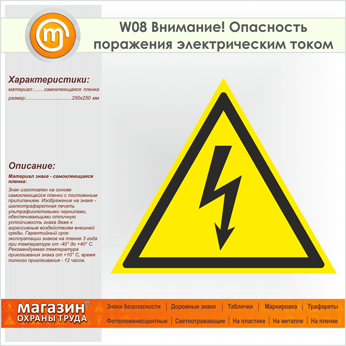 Знак W08 «Внимание! опасность поражения электрическим током» (пленка, сторона 250 мм) в Твери купить