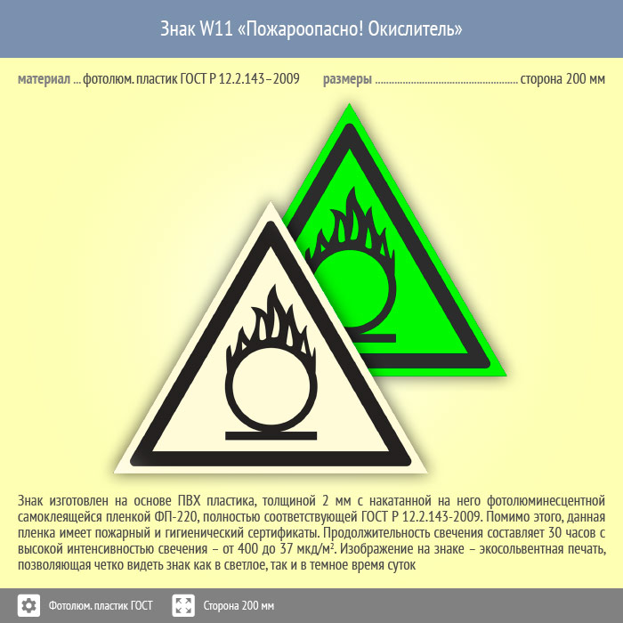 Знак W11 «Пожароопасно! Окислитель» (фотолюминесцентный пластик ГОСТ 34428-2018, сторона 200 мм) в Твери купить