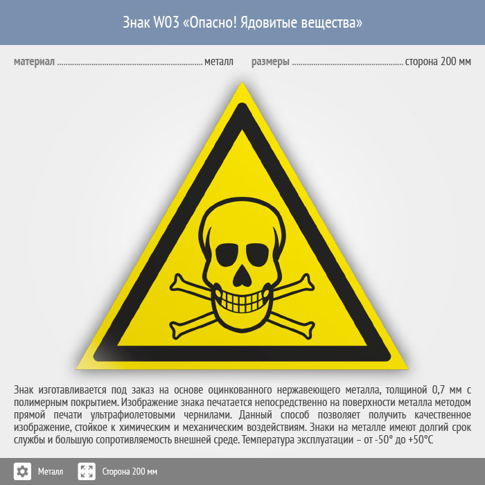 Знак W03 «Опасно! ядовитые вещества» (металл, сторона 200 мм) в Твери купить