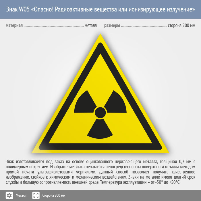 Знак W05 «Опасно! радиоактивные вещества или ионизирующее излучение» (металл, сторона 200 мм) в Твери купить