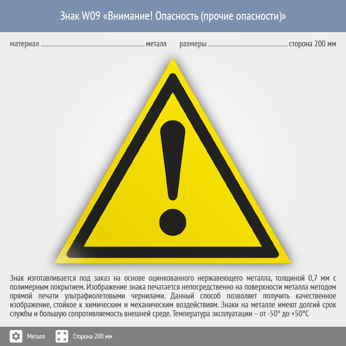 Знак W09 «Внимание! опасность (прочие опасности)» (металл, сторона 200 мм) в Твери купить
