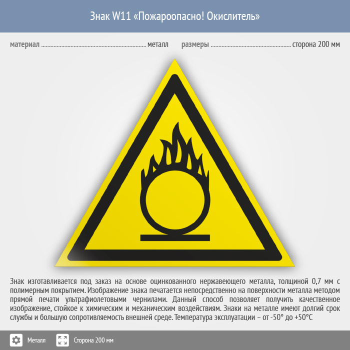 Знак W11 «Пожароопасно! окислитель» (металл, сторона 200 мм) в Твери купить
