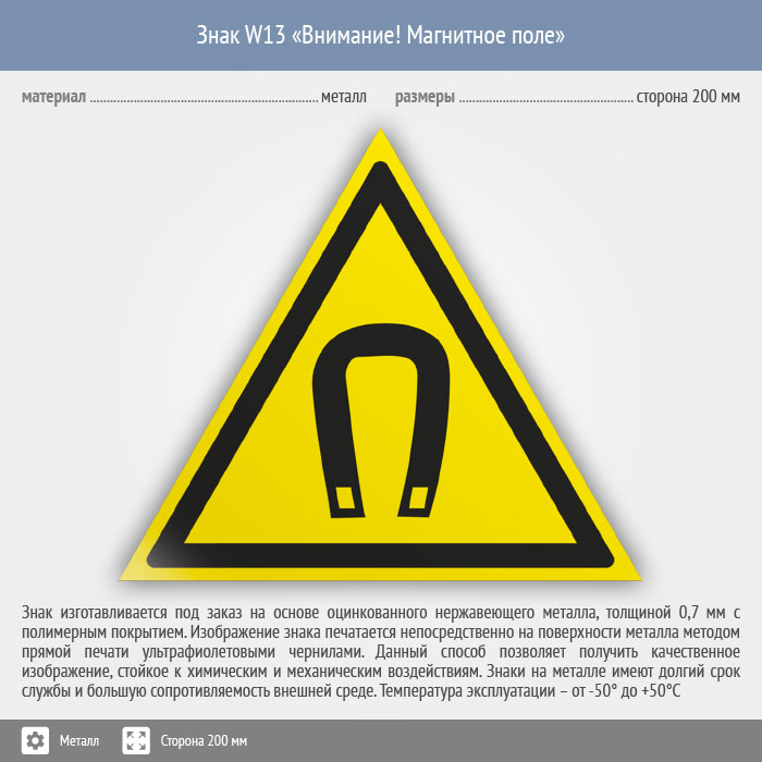Знак W13 «Внимание! магнитное поле» (металл, сторона 200 мм) в Твери купить