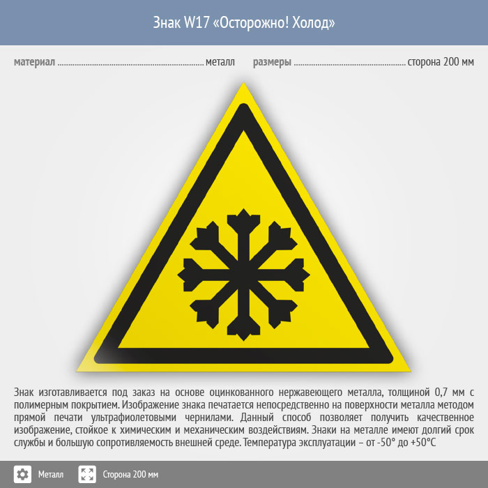 Знак W17 «Осторожно! холод» (металл, сторона 200 мм) в Твери купить