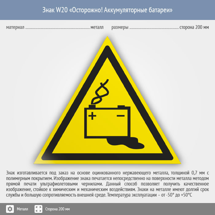 Знак W20 «Осторожно! аккумуляторные батареи» (металл, сторона 200 мм) в Твери купить