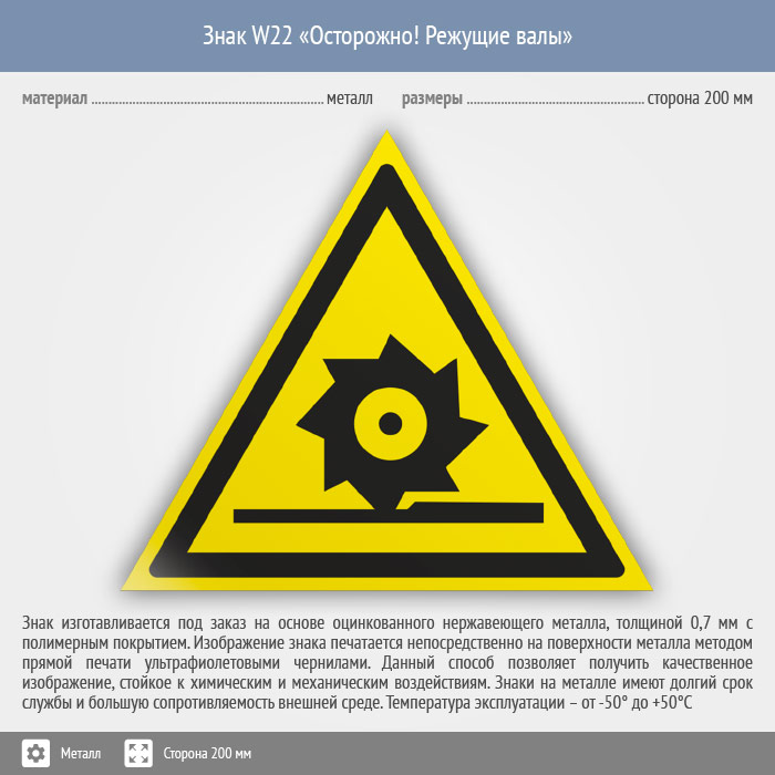 Знак W22 «Осторожно! режущие валы» (металл, сторона 200 мм) в Твери купить