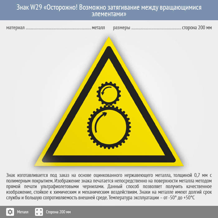 Знак W29 «Осторожно! возможно затягивание между вращающимися элементами» (металл, сторона 200 мм) в Твери купить