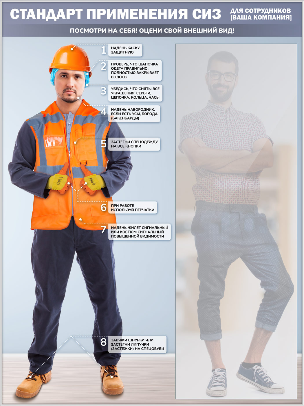 Стенд для демонстрации применения СИЗ с зеркалом, 1500х2000 мм в серебряном багете (СПС-03-С) в Твери купить