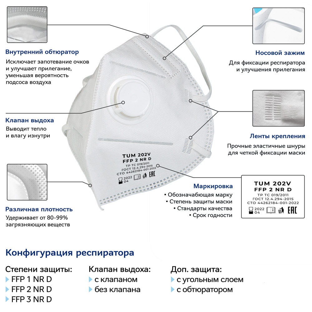 Респиратор противоаэрозольный TUM 102СV (FFP1) с клапаном и угольным слоем, к-т 10 шт в Твери купить
