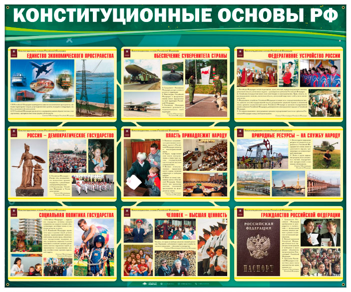 Стенд «Конституционные основы Российской Федерации» (VU-01) предназначен для знакомства с основами констинуции РФ. Что РФ - демократическое государство, что его высшей целью является человек, как обеспечивается народовластие в стране, охрана суверенитета, как осуществляется федеративное устройство РФ, кто может быть гражданином РФ, что лежит в основе социальной политики государства, что собой представляет система государственной власти в стране.