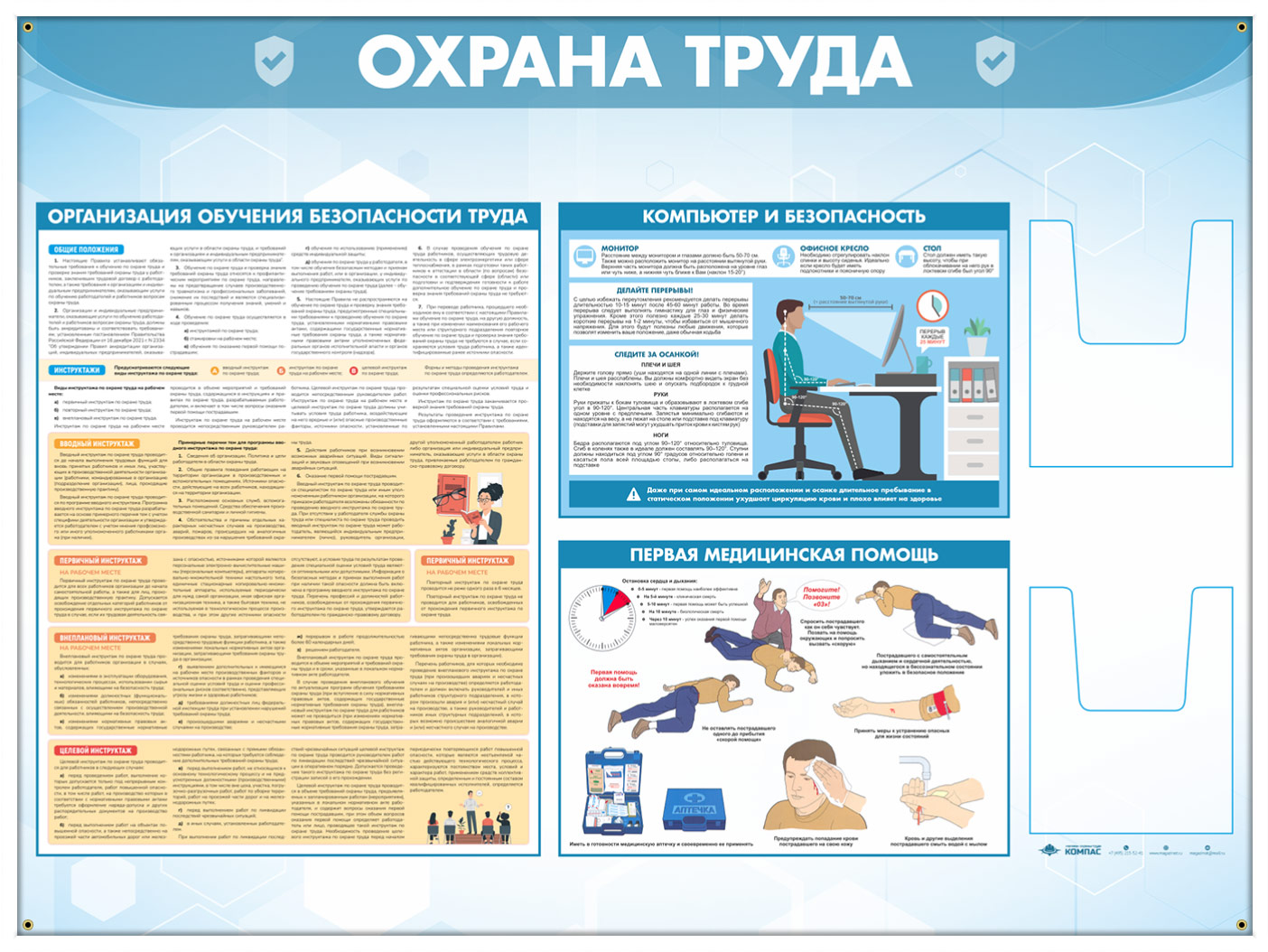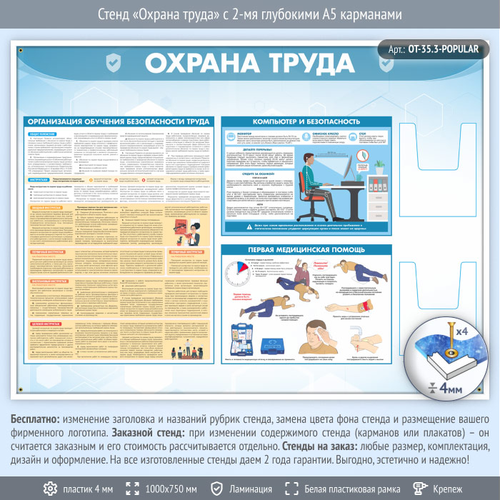 Стенд «Охрана труда» с 2-мя глубокими А5 карманами содержит общую информацию об охране труда