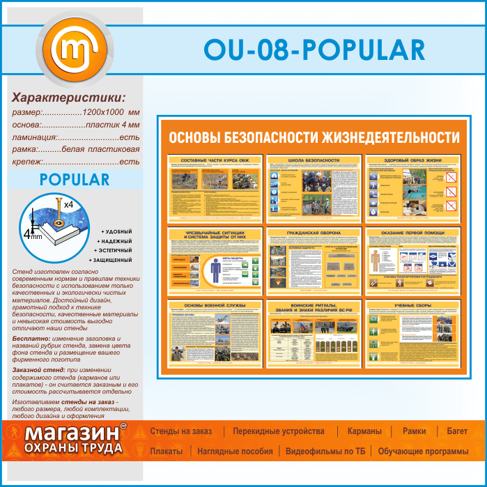 Стенд «Основы безопасности жизнедеятельности» – это отличный наглядный учебный материал для ОБЖ. На стенде размещена общая информация о составных частях ОБЖ, что включает в себя школа безопасности. Стенд агитирует читателя к здоровому образу жизни, учит оказанию первой доврачебной помощи, рассказывает о чрезвычайных ситуациях и знакомит с системой защиты от ЧС. На стенде также размещена информация по гражданской обороне, основам военной службы, воинским ритуалам и военным сборам