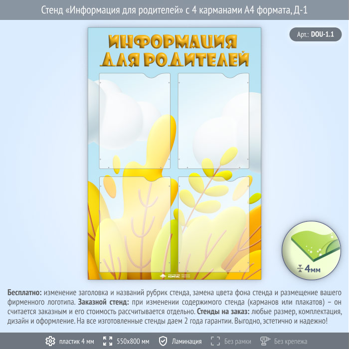 Стенд «Информация для родителей» с 4 карманами А4 формата (DOU-1.1) в Твери купить