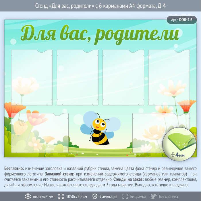 Стенд «Для вас, родители» с 6 карманами А4 формата (DOU-4.6) в Твери купить