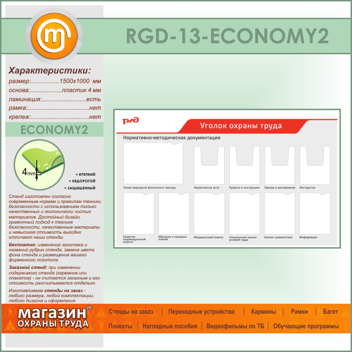 Стенд «Уголок охраны труда» с 1 плоским карманом А3 формата, 6 плоскими и 4 объемными карманами А4 формата (RGD-13-ECONOMY2) в Твери купить