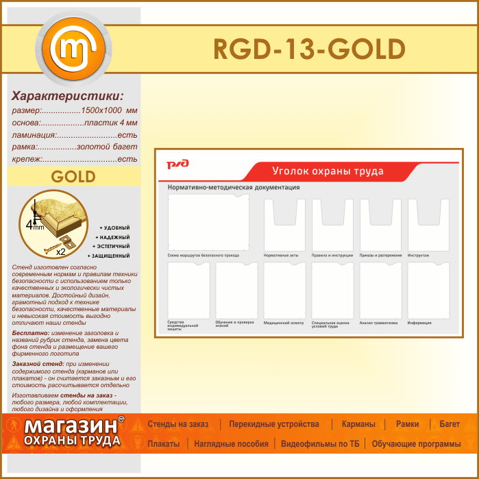 Стенд «Уголок охраны труда» с 1 плоским карманом А3 формата, 6 плоскими и 4 объемными карманами А4 формата (RGD-13-GOLD) в Твери купить