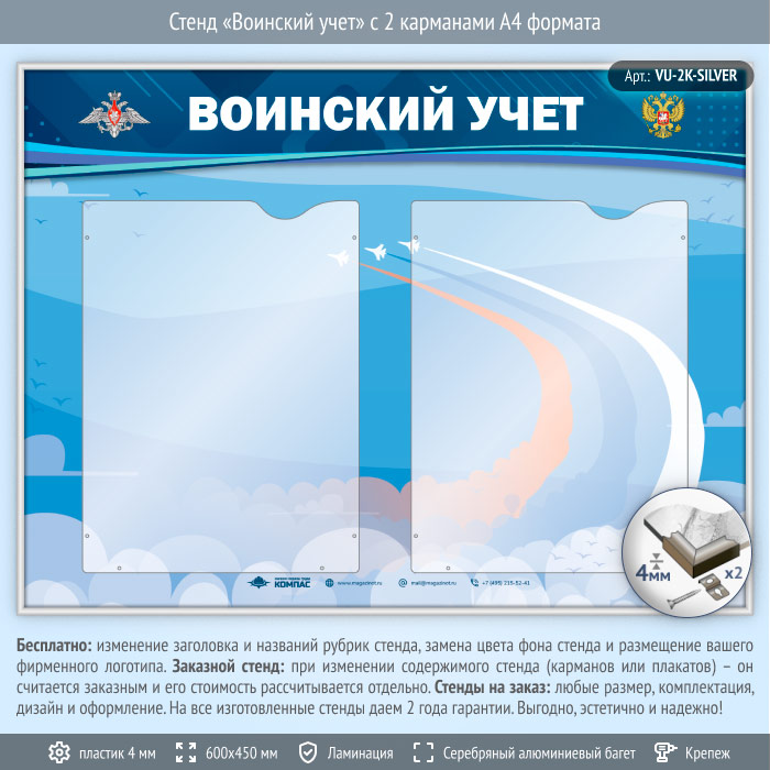 Стенд «Воинский учет» с 2 карманами А4 формата (VU-2K-SILVER) в Твери купить