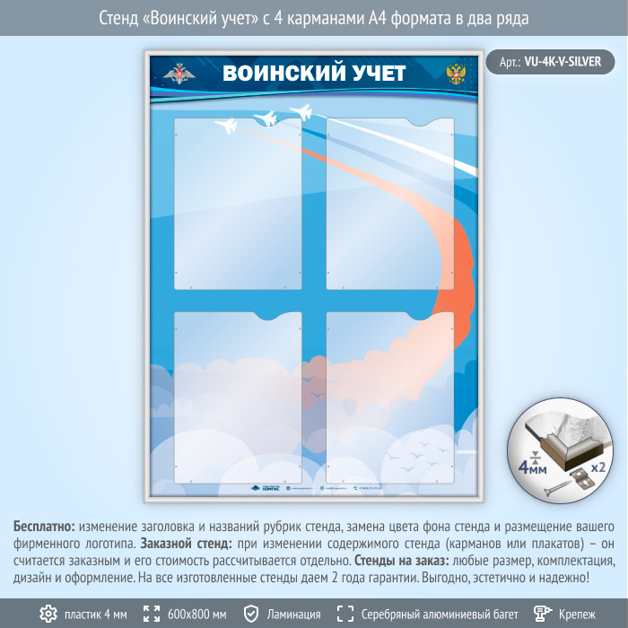 Стенд «Воинский учет» с 4 карманами А4 формата в два ряда (VU-4K-V-SILVER) в Твери купить