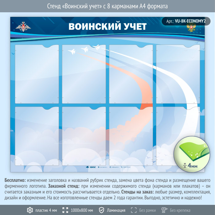 Стенд «Воинский учет» с 8 карманами А4 формата (VU-8K-ECONOMY2) в Твери купить