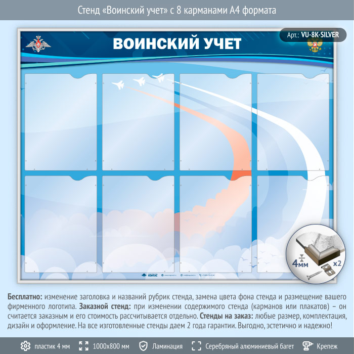 Стенд «Воинский учет» с 8 карманами А4 формата (VU-8K-SILVER) в Твери купить