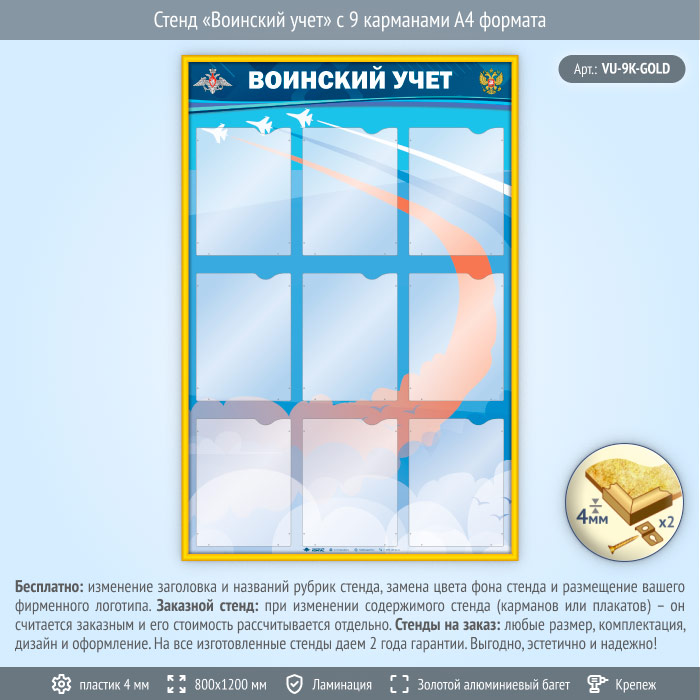 Стенд «Воинский учет» с 9 карманами А4 формата (VU-9K-GOLD) в Твери купить