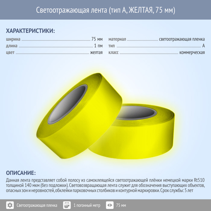 Светоотражающая однородная лента (тип А, ЖЕЛТАЯ, 75 мм х 1 п.м.) в Твери купить