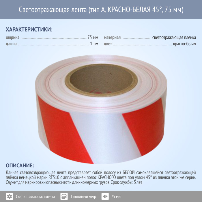 Светоотражающая сигнальная лента (тип А, КРАСНО-БЕЛАЯ 45°, 75 мм х 1 п.м.) в Твери купить