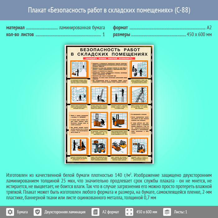 Плакат «Безопасность работ в складских помещениях» (С-88, ламинированная бумага, А2, 1 лист) в Твери купить