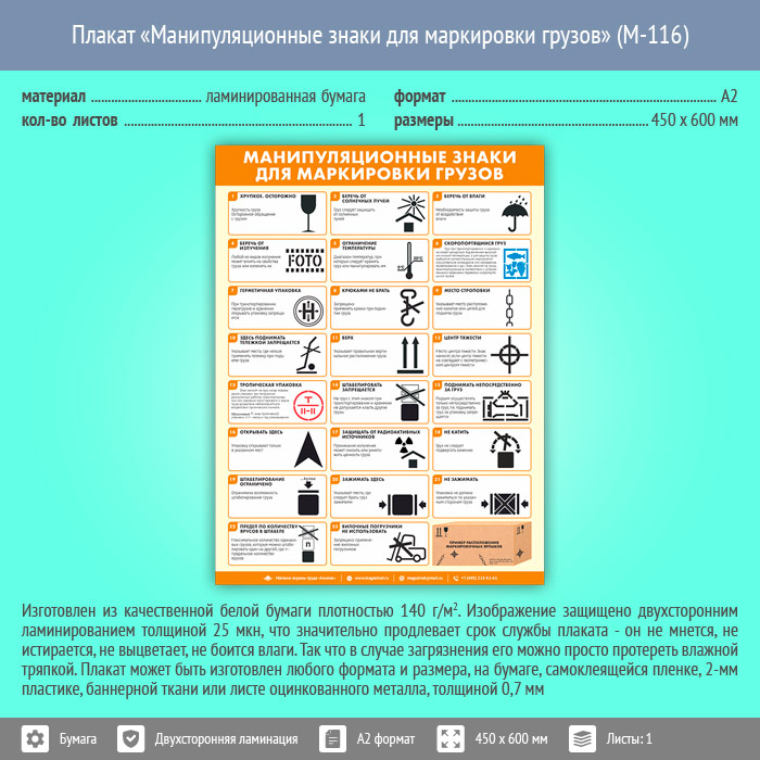Плакат «Манипуляционные знаки для маркировки грузов» (М-116, ламинированная бумага, А2, 1 лист) в Твери купить