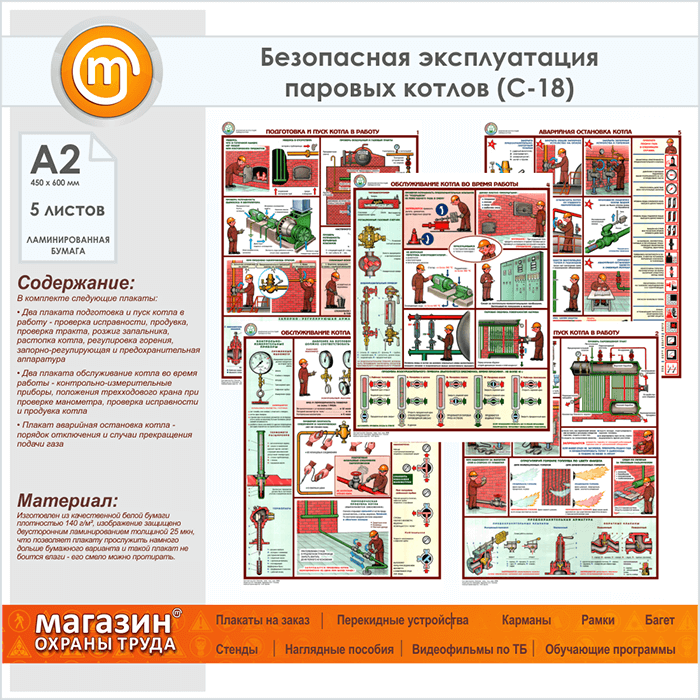 Плакаты «Безопасная эксплуатация паровых котлов» (С-18, ламинированная бумага, А2, 5 листов) в Твери купить