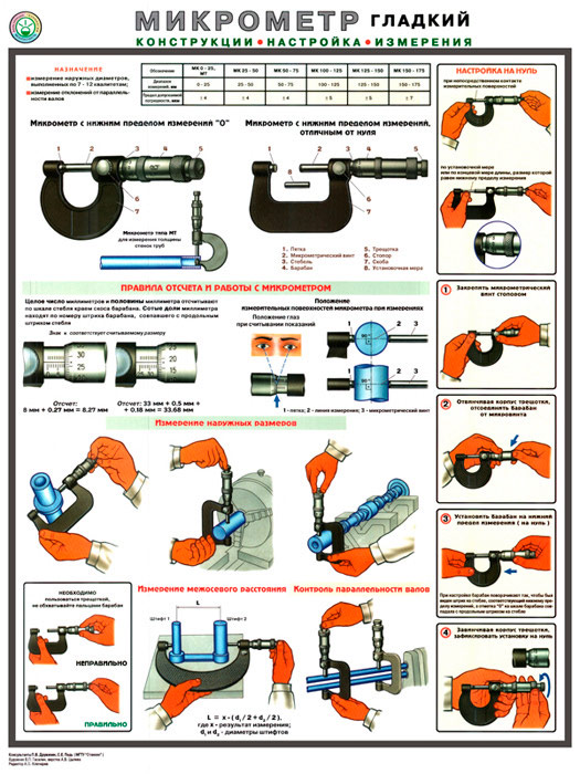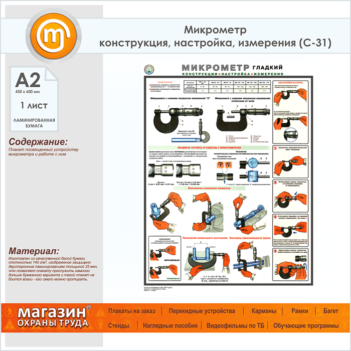 Плакат «Микрометр - конструкция, настройка, измерения» (С-31, ламинированная бумага, А2, 1 лист) в Твери купить