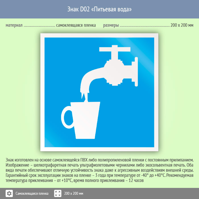 Знак D02 «Питьевая вода» (пленка, 200х200 мм) в Твери купить