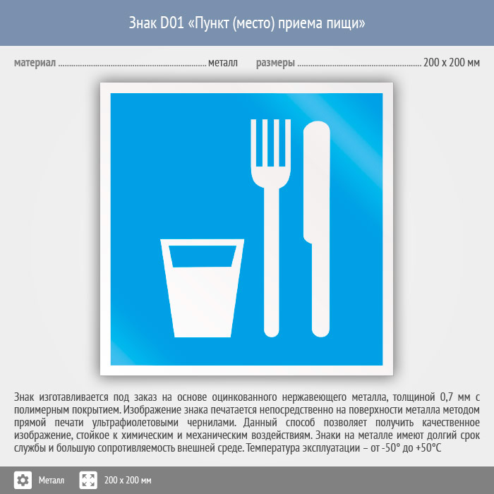 Знак D01 «Пункт (место) приема пищи» (металл, 200х200 мм) в Твери купить