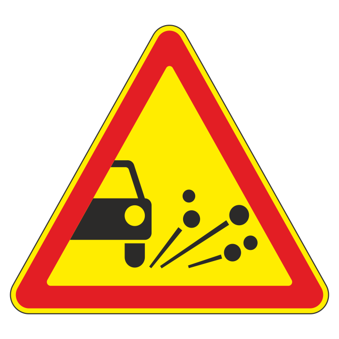Дорожный знак 1.18 «Выброс гравия» (временный) (металл 0,8 мм, III типоразмер: сторона 1200 мм, С/О пленка: тип А инженерная) в Твери купить