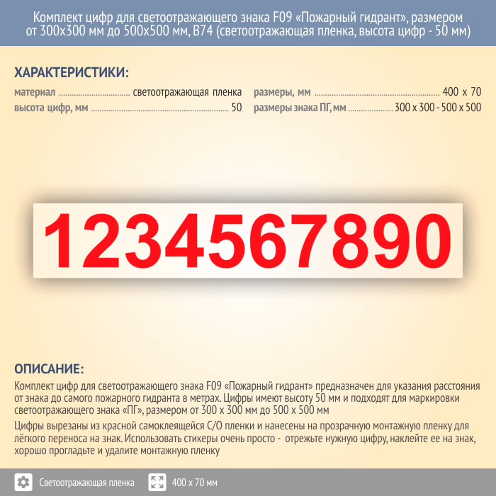 Комплект цифр для светоотражающего знака F09 «Пожарный гидрант», размером от 300х300 мм до 500х500 мм, В74 (светоотражающая пленка, 400х70 мм, высота цифр - 50 мм) в Твери купить