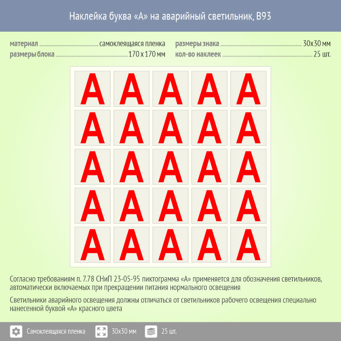 Наклейка буква «А» на аварийный светильник, B93 (пленка, 30х30 мм, блок 25 штук, 170х170 мм) в Твери купить