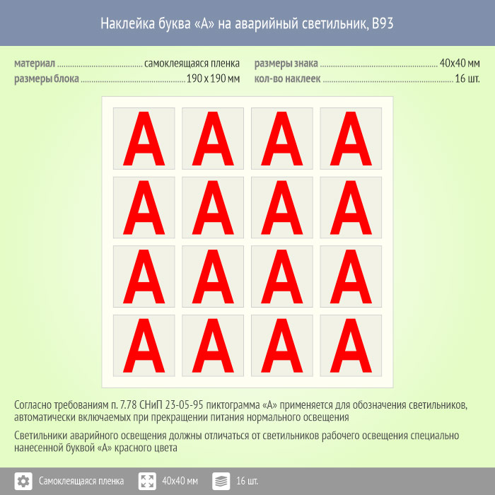 Наклейка буква «А» на аварийный светильник, B93 (пленка, 40х40 мм, блок 16 штук, 190х190 мм) в Твери купить