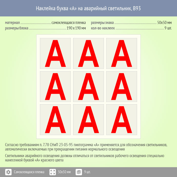 Наклейка буква «А» на аварийный светильник, B93 (пленка, 50х50 мм, блок 9 штук, 190х190 мм) в Твери купить