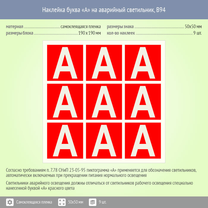 Наклейка буква «А» на аварийный светильник, B94 (пленка, 50х50 мм, блок 9 штук, 190х190 мм) в Твери купить