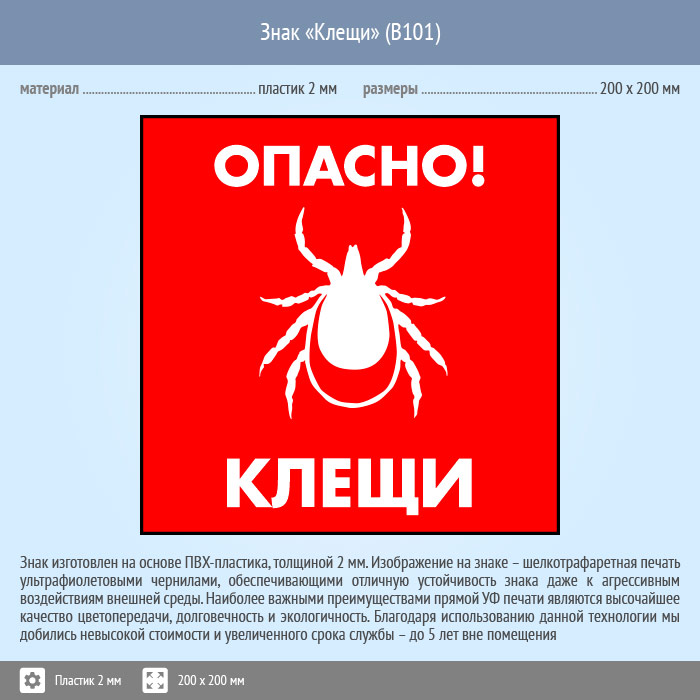Знак «Опасно! Клещи», B101 (пластик, 200х200 мм) в Твери купить