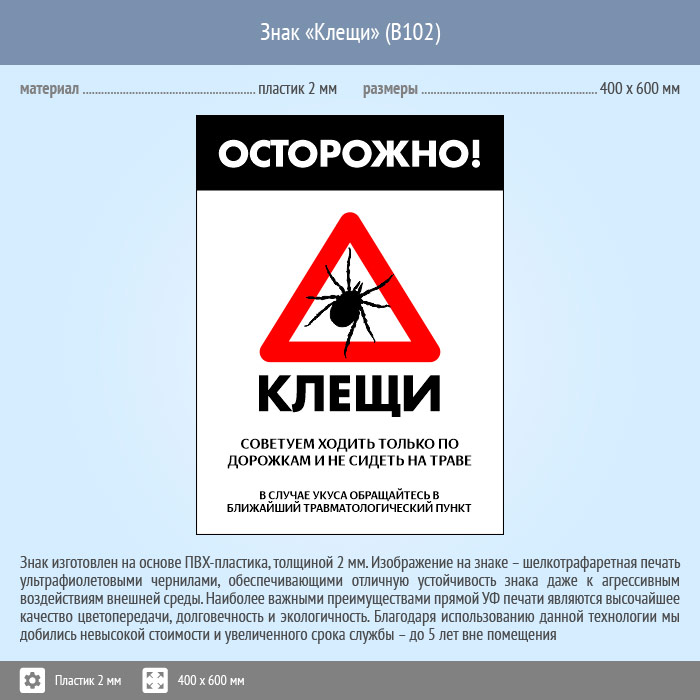 Знак «Осторожно! Клещи», B102 (пластик, 300х400 мм) в Твери купить