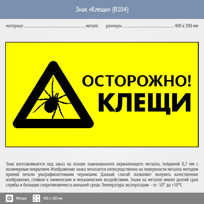 Знак «Осторожно! Клещи», B104 (металл, 300х200 мм) в Твери купить