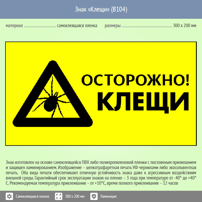 Знак «Осторожно! Клещи», B104 (пленка c ламинированием, 400х300 мм) в Твери купить