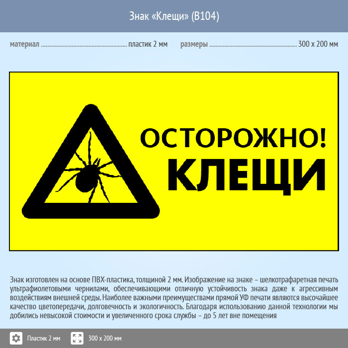 Знак «Осторожно! Клещи», B104 (пластик, 400х300 мм) в Твери купить