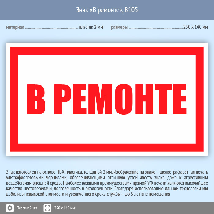 Знак «В ремонте», B105 (пластик, 250х140 мм) в Твери купить