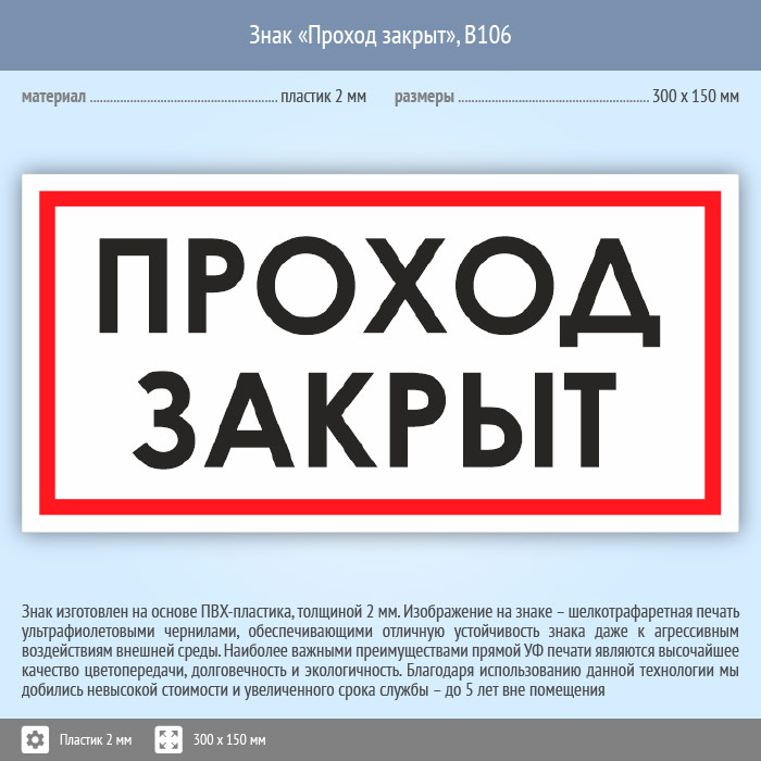 Знак «Проход закрыт», B106 (пластик, 300х150 мм) в Твери купить